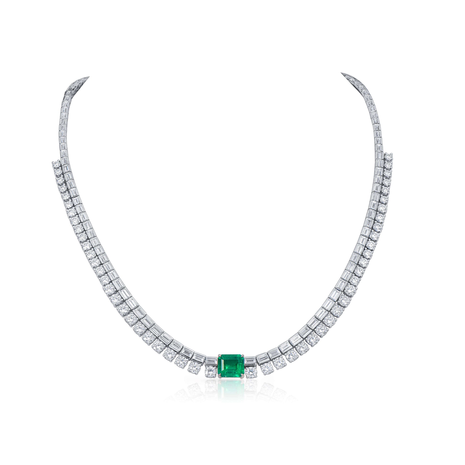 18K White Gold Statement Necklace With 2.25 TCW Emerald Shape Natural Emerald, C.DUNAIGRE Certified