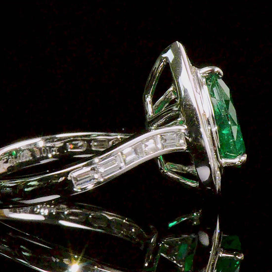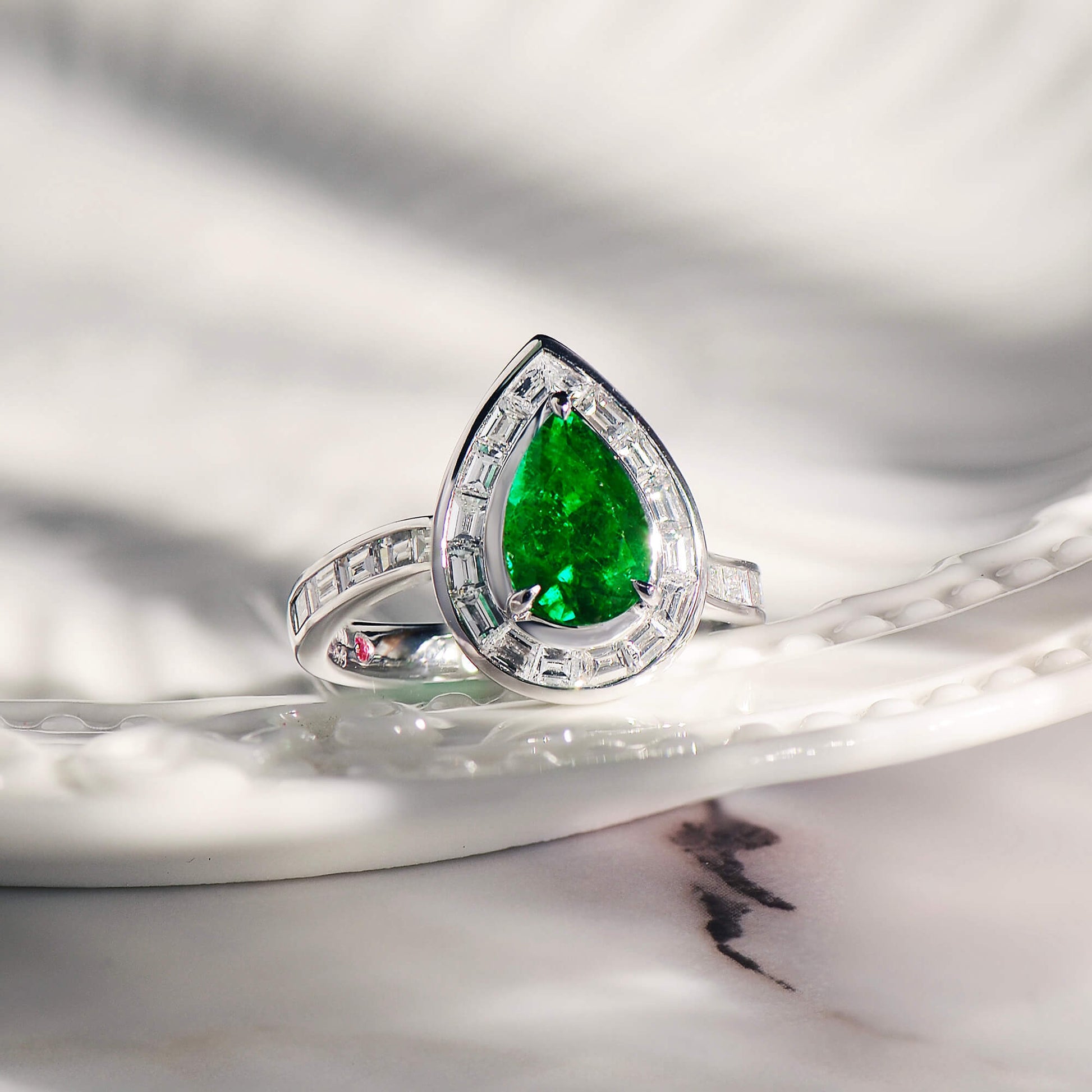 18K White Gold Statement Ring With 1.45 TCW Pear Shape Natural Emerald, GRS Certified