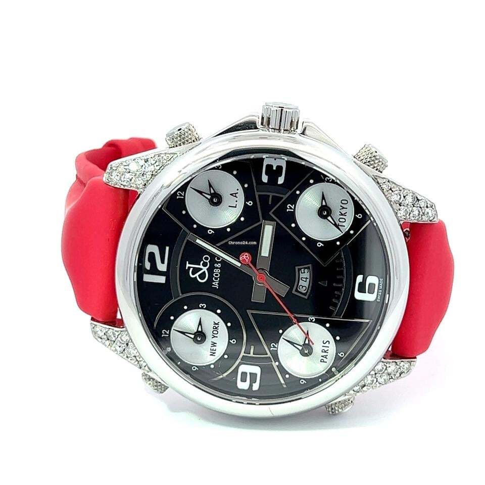 Jacob & Co. Five Time Zone Quartz Men's Watch Steel Case With Leather Strap Authentic Luxury Timepiece